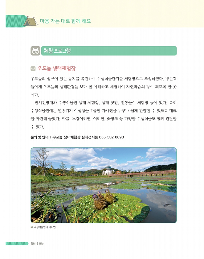 창녕 우포늪 체험 프로그램 우포늪 생태체험장 우포늪의 상류에 있는 농지를 복원하여 수생식물단지를 체험장으로 조성하였다. 방문객 들에게 우포늪의 생태환경을 보다 잘 이해하고 체험하여 자연학습의 장이 되도록 한 곳 이다. 전시전망대와 수생식물원 생태 체험장, 생태 텃밭, 전통놀이 체험장 등이 있다. 특히 수생식물원에는 멸종위기 야생생물Ⅱ급인 가시연을 누구나 쉽게 관찰할 수 있도록 데크 를 마련해 놓았다. 마름, 노랑어리연, 어리연, 꽃창포 등 다양한 수생식물도 함께 관찰할 수 있다. 문의 및 안내 | 우포늪 생태체험장 실내전시동 055-532-0090 수생식물원의가시연 A S O M J J A S O M J J A S O May Jun Jul Aug Sep Oct 2009 2010 2011 2012 2013 2...