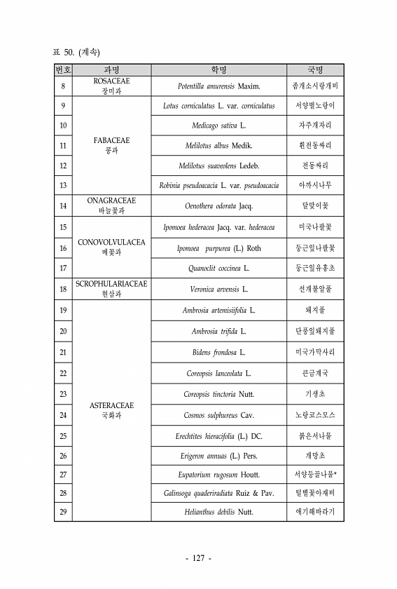 표 50. 계속 번호 과명 학명 국명 8 ROSACEAE 장미과 Potentilla amurensis Maxim. 좀개소시랑개비 9 FABACEAE 콩과 Lotus corniculatus L. var. corniculatus 서양벌노랑이 10 Medicago sativa L. 자주개자리 11 Melilotus albus Medik. 흰전동싸리 12 Melilotus suaveolens Ledeb. 전동싸리 13 Robinia pseudoacacia L. var. pseudoacacia 아까시나무 14 ONAGRACEAE 바늘꽃과 Oenothera odorata Jacq. 달맞이꽃 15 CONOVOLVULACEA 메꽃과 Ipomoea hederacea Jacq. var. hederacea 미국나팔꽃 16 Ip...