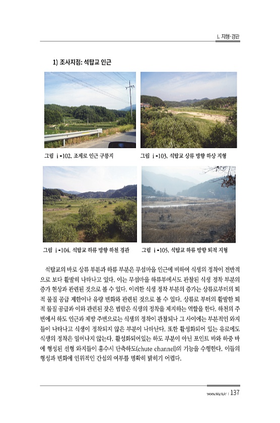 i. 지형·경관 www.nie.re.kr ?137 1 그림 ⅰ-102. 조제로 인근 구릉지 그림 ⅰ-103. 석탑교 상류 방향 하상 지형 그림 ⅰ-104. 석탑교 하류 방향 하천 경관 그림 ⅰ-105. 석탑교 하류 방향 퇴적 지형 석탑교의 바로 상류 부분과 하류 부분은 무섬마을 인근에 비하여 식생의 정착이 전반적 으로 보다 활발히 나타나고 있다. 이는 무섬마을 하류부에서도 관찰된 식생 정착 부분의 증가 현상과 관련된 것으로 볼 수 있다. 이러한 식생 정착 부분의 증가는 상류로부터의 퇴 적 물질 공급 제한이나 유량 변화와 관련된 것으로 볼 수 있다. 상류로 부터의 활발한 퇴 적 물질 공급과 이와 관련된 잦은 범람은 식생의 정착을 제지하는 역할을 한다. 하천의 주 변에서 하도 인근과 제방 주변으로는 식생의 정착...