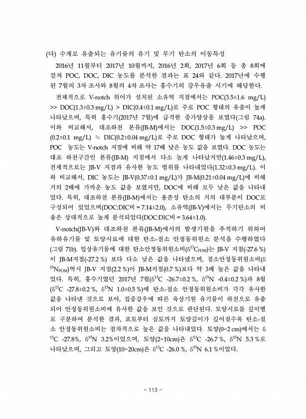 다 수계로 유출되는 유기물의 유기 및 무기 탄소의 이동특성 2016년 11월부터 2017년 10월까지, 2016년 2회, 2017년 6회 등 총 8회에 걸쳐 POC, DOC, DIC 농도를 분석한 결과는 표 24와 같다. 2017년에 수행 된 7월의 3차조사와 8월의 4차조사는 홍수기의 강우유출 시기에 해당한다. 전체적으로 V-notch 위어가 설치된 소유역 지점에서는 POC 3.5±1.6 mg/L DOC 1.3±0.3 mg/L DIC 0.4±0.1 mg/L 로 주로 POC 형태의 유출이 높게 나타났으며, 특히 홍수기 2017년 7월 에 급격한 증가양상을 보였다 그림 74a 이와 비교해서, 대조하천 본류 JB-M 에서는 DOC 1.5±0.3 mg/L POC 0.2±0.1 mg/L ≒ DIC 0.2±0.04 ...
