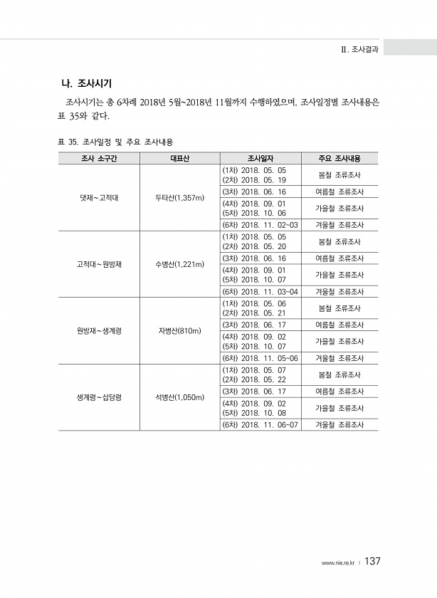 Ⅱ. 조사결과 www.nie.re.kr ? 137 나. 조사시기 조사시기는 총 6차례 2018년 5월2018년 11월까지 수행하였으며, 조사일정별 조사내용은 표 35와 같다. 표 35. 조사일정 및 주요 조사내용 조사 소구간 대표산 조사일자 주요 조사내용 댓재∼고적대 두타산 1,357m 1차 2018. 05. 05 2차 2018. 05. 19 봄철 조류조사 3차 2018. 06. 16 여름철 조류조사 4차 2018. 09. 01 5차 2018. 10. 06 가을철 조류조사 6차 2018. 11. 0203 겨울철 조류조사 고적대∼원방재 수병산 1,221m 1차 2018. 05. 05 2차 2018. 05. 20 봄철 조류조사 3차 2018. 06. 16 여름철 조류조사 4차 2018. 09. 01 5차 201...