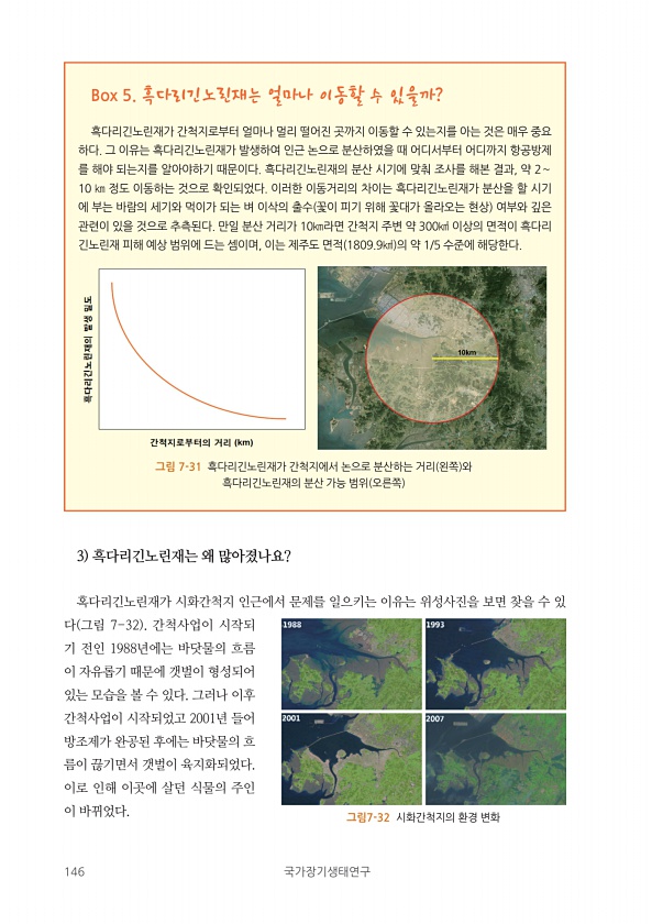 146 국가장기생태연구 Box 5. 흑다리긴노린재는 얼마나 이동할 수 있을까? 흑다리긴노린재가 간척지로부터 얼마나 멀리 떨어진 곳까지 이동할 수 있는지를 아는 것은 매우 중요 하다. 그 이유는 흑다리긴노린재가 발생하여 인근 논으로 분산하였을 때 어디서부터 어디까지 항공방제 를 해야 되는지를 알아야하기 때문이다. 흑다리긴노린재의 분산 시기에 맞춰 조사를 해본 결과, 약 2~ 10 ㎞ 정도 이동하는 것으로 확인되었다. 이러한 이동거리의 차이는 흑다리긴노린재가 분산을 할 시기 에 부는 바람의 세기와 먹이가 되는 벼 이삭의 출수 꽃이 피기 위해 꽃대가 올라오는 현상 여부와 깊은 관련이 있을 것으로 추측된다. 만일 분산 거리가 10㎞라면 간척지 주변 약 300㎢ 이상의 면적이 흑다리 긴노린재 피해 예상 범위에 드는 ...