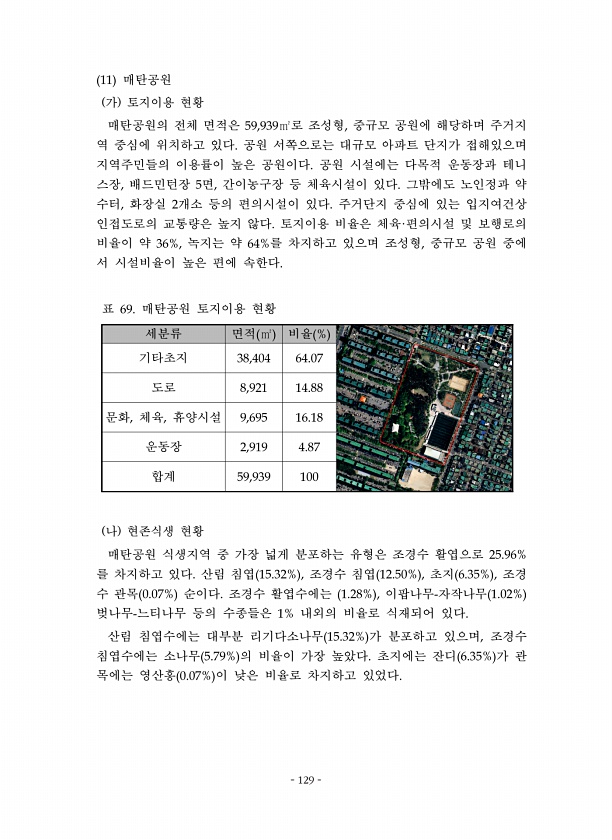 129 매탄공원 가 토지이용 현황 매탄공원의 전체 면적은 로 조성형 중규모 공원에 해당하며 주거지 역 중심에 위치하고 있다 공원 서쪽으로는 대규모 아파트 단지가 접해있으며 지역주민들의 이용률이 높은 공원이다 공원 시설에는 다목적 운동장과 테니 스장 배드민턴장 면 간이농구장 등 체육시설이 있다 그밖에도 노인정과 약 수터 화장실 개소 등의 편의시설이 있다 주거단지 중심에 있는 입지여건상 인접도로의 교통량은 높지 않다 토지이용 비율은 체육 편의시설 및 보행로의 비율이 약 녹지는 약 를 차지하고 있으며 조성형 중규모 공원 중에 서 시설비율이 높은 편에 속한다 세분류 면적 비율 기타초지 도로 문화 체육 휴양시설 운동장 합계 표 매탄공원 토지이용 현황 나 현존식생 현황 매탄공원 식생지역 중 가장 넓게 분포하는 유형은 ...