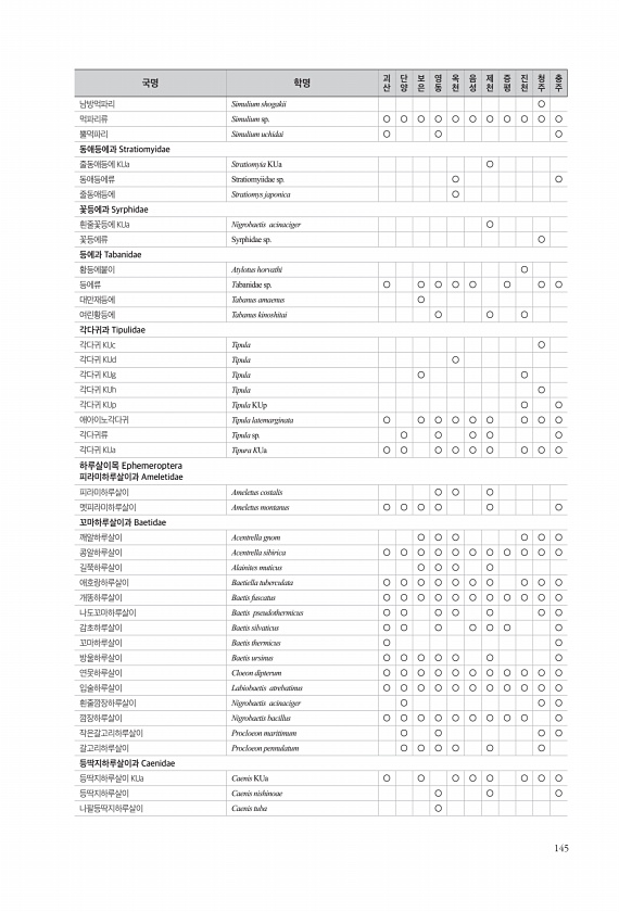 145 남방먹파리 Simulium shogakii ○ 먹파리류 Simulium sp. ○ ○ ○ ○ ○ ○ ○ ○ ○ ○ ○ 뿔먹파리 Simulium uchidai ○ ○ ○ 동애등에과 Stratiomyidae 줄동애등에 KUa Stratiomyia KUa ○ 동애등에류 Stratiomyiidae sp. ○ ○ 줄동애등에 Stratiomys japonica ○ 꽃등에과 Syrphidae 흰줄꽃등에 KUa Nigrobaetis acinaciger ○ 꽃등에류 Syrphidae sp. ○ 등에과 Tabanidae 황등에붙이 Atylotus horvathi ○ 등에류 Tabanidae sp. ○ ○ ○ ○ ○ ○ ○ ○ 대만재등에 Tabanus amaenus ○ 여린황등에 Tabanus kinoshitai ○ ○...