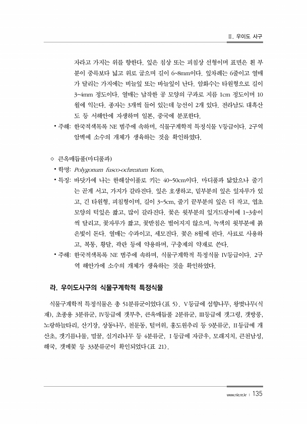 Ⅱ. 우이도 사구 www.nie.re.kr ? 135 자라고 가지는 위를 향한다. 잎은 침상 또는 피침상 선형이며 표면은 흰 부 분이 중륵보다 넓고 위로 굽으며 길이 68mm이다. 잎차례는 6줄이고 열매 가 달리는 가지에는 비늘잎 또는 바늘잎이 난다. 암화수는 타원형으로 길이 34mm 정도이다. 열매는 납작한 공 모양의 구과로 지름 1cm 정도이며 10 월에 익는다. 종자는 3개씩 들어 있는데 능선이 2개 있다. 전라남도 대흑산 도 등 서해안에 자생하며 일본, 중국에 분포한다. ?주해한국적색목록 NE 범주에 속하며, 식물구계학적 특정식물 V등급이다. 2구역 암벽에 소수의 개체가 생육하는 것을 확인하였다. ◇ 큰옥매듭풀 마디풀과 ?학명Polygonum fusco-ochreatum Kom. ?특징바닷가에 나는 ...
