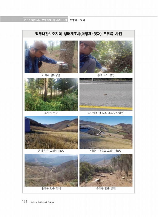 2017 백두대간보호지역 생태계 조사 화방재 댓재 136 ? National Institute of Ecology 백두대간보호지역 생태계조사 화방재댓재 포유류 사진 카메라 설치장면 흔적 조사 장면 조사지 전경 조사지역 내 도로 로드킬 다람쥐 큰재 인근 고냉지채소밭 매봉산 대규모 고냉지채소밭 푯대봉 인근 별채 푯대봉 인근별채