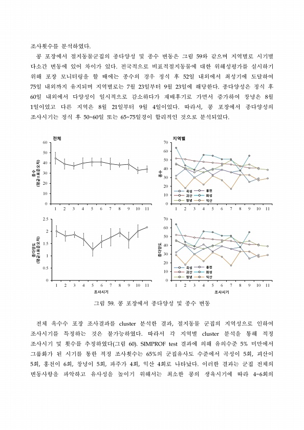 조사횟수를 분석하였다. 콩 포장에서 절지동물군집의 종다양성 및 종수 변동은 그림 59와 같으며 지역별로 시기별 다소간 변동에 있어 차이가 있다. 전국적으로 비표적절지동물에 대한 위해성평가를 실시하기 위해 포장 모니터링을 할 때에는 종수의 경우 정식 후 52일 내외에서 최성기에 도달하여 75일 내외까지 유지되며 지역별로는 7월 23일부터 9월 23일에 해당한다. 종다양성은 정식 후 60일 내외에서 다양성이 일시적으로 감소하다가 재배후기로 가면서 증가하여 창녕은 8월 1일이었고 다른 지역은 8월 21일부터 9월 4일이었다. 따라서, 콩 포장에서 종다양성의 조사시기는 정식 후 5060일 또는 6575일경이 합리적인 것으로 분석되었다. 그림 59. 콩 포장에서 종다양성 및 종수 변동 전체 옥수수 포장 조사결과를 c...