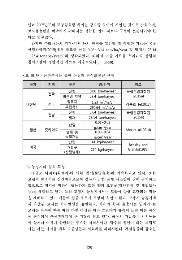 년과 년도의 토양침식량 차이는 강수량 차이에 기인한 것으로 밝혔으며 토사유출량을 예측하기 위해서는 적합한 입력 자료의 구축이 선행되어야 한 다고 덧붙였다 하지만 우리나라의 지형 기후 등의 환경을 고려할 때 적합한 자료는 국립 산림과학원 에서 발표한 산림 및 벌채지 이라 생각되었다 따라서 이들 자료를 우리나라 산림의 침식조절의 정량적인 자료로 사용하였다 표 국가 지역 구분 수량/단위 참고 대한민국 전국 산림 0.06 ton/ha/year 국립산림과학원 비산림 지역 23.4 ton/ha/year 2015a 전국 입목지 1.23 m/ha/yr 김종호 등 2012 무립목지 290.64 m/ha/yr 전남 산림 3.64 ton/ha/year 국립산림과학원 벌채 23.14 ton/ha/year 2015b 일본 훗카...