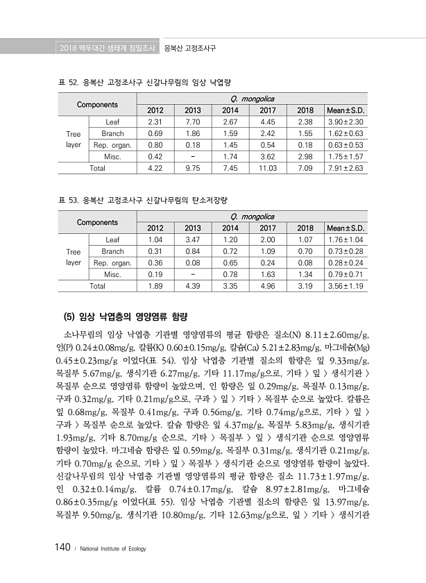2018 백두대간 생태계 정밀조사 응복산 고정조사구 140 ? National Institute of Ecology Components Q. mongolica 2012 2013 2014 2017 2018 Mean±S.D. Tree layer Leaf 2.31 7.70 2.67 4.45 2.38 3.90±2.30 Branch 0.69 1.86 1.59 2.42 1.55 1.62±0.63 Rep. organ. 0.80 0.18 1.45 0.54 0.18 0.63±0.53 Misc. 0.42 1.74 3.62 2.98 1.75±1.57 Total 4.22 9.75 7.45 11.03 7.09 7.91±2.63 표 52. 응복산 고정조사구 신갈나무림의 임상 낙엽량 Components Q. mongolica 2012...