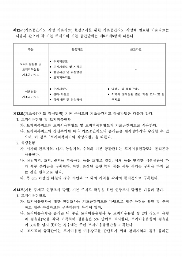제12조 기초공간지도 작성 기초자료 현장조사를 위한 기초공간지도 작성에 필요한 기초자료는 다음과 같으며 각 기본 주제도의 기본 공간단위는 제8조제8항에 따른다. 제13조 기초공간지도 작성방법 기본 주제도의 기초공간지도 작성방법은 다음과 같다. 1. 토지이용현황 및 토지피복현황 가. 토지피복지도를 토지이용현황도 및 토지피복현황도의 기초공간지도로 사용한다. 나. 토지피복지도의 갱신주기에 따라 기초공간지도의 폴리곤을 재작성하거나 수정할 수 있 으며, 이 경우「토지피복지도의 작성지침」을 따른다. 2. 식생현황 가. 시가화·건조지역, 나지, 농업지역, 수역의 기본 공간단위는 토지이용현황도의 폴리곤을 사용한다. 나. 산림지역, 초지, 습지는 항공사진 등을 토대로 질감, 색채 등을 반영한 식생상관에 따 라 세부 폴리곤을...