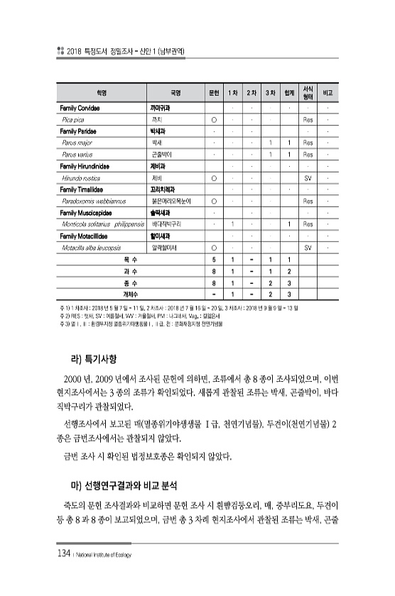2018 특정도서 정밀조사 신안 1 남부권역 134 ? National Institute of Ecology 2000 년, 2009 년에서 조사된 문헌에 의하면, 조류에서 총 8 종이 조사되었으며, 이번 현지조사에서는 3 종의 조류가 확인되었다. 새롭게 관찰된 조류는 박새, 곤줄박이, 바다 직박구리가 관찰되었다. 선행조사에서 보고된 매 멸종위기야생생물 Ⅰ급, 천연기념물 , 두견이 천연기념물 2 종은 금번조사에서는 관찰되지 않았다. 금번 조사 시 확인된 법정보호종은 확인되지 않았다. 죽도의 문헌 조사결과와 비교하면 문헌 조사 시 흰뺨검둥오리, 매, 중부리도요, 두견이 등 총 8 과 8 종이 보고되었으며, 금번 총 3 차례 현지조사에서 관찰된 조류는 박새, 곤줄 학명 국명 문헌 1 차 2 차 3 차 합계 서식 ...