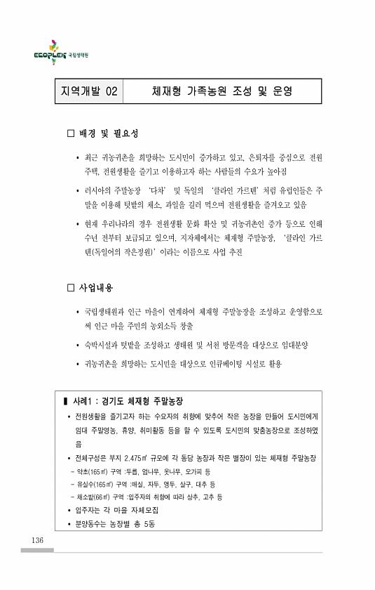 136 ? 사례1 경기도 체재형 주말농장 ? 전원생활을 즐기고자 하는 수요자의 취향에 맞추어 작은 농장을 만들어 도시민에게 임대 주말영농, 휴양, 취미활동 등을 할 수 있도록 도시민의 맞춤농장으로 조성하였 음 ? 전체구성은 부지 2.475㎡ 규모에 각 동당 농장과 작은 별장이 있는 체재형 주말농장 약초 165㎡ 구역 두릅, 엄나무, 옷나무, 오가피 등 유실수 165㎡ 구역 매실, 자두, 앵두, 살구, 대추 등 채소밭 66㎡ 구역 입주자의 취향에 따라 상추, 고추 등 ? 입주자는 각 마을 자체모집 ? 분양동수는 농장별 총 5동 지역개발 02 체재형 가족농원 조성 및 운영 □ 배경 및 필요성 ? 최근 귀농귀촌을 희망하는 도시민이 증가하고 있고, 은퇴자를 중심으로 전원 주택, 전원생활을 즐기고 이용하고자 하는 사...
