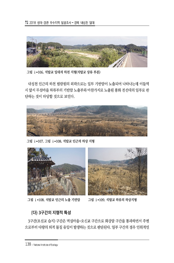 2018 생태·경관 우수지역 발굴조사 경북 내성천 일대 138 ? National Institute of Ecology 그림 ⅰ-106. 석탑교 일대의 하천 지형 석탑교 상류 부분 내성천 인근의 하천 범람원의 외곽으로는 일부 기반암이 노출되어 나타나는데 이들역 시 앞서 무섬마을 하류부의 기반암 노출부와 마찬가지로 노출된 풍화 전선대의 일부로 판 단하는 것이 타당할 것으로 보인다. 3 3구간 오신교 습지 구간은 멱실마을-오신교 구간으로 화강암 구간을 통과하면서 주변 으로부터 다량의 퇴적 물질 유입이 발생하는 것으로 판단된다. 일부 구간의 경우 인위적인 그림 ⅰ-107. 그림 ⅰ-108. 석탑교 인근의 하상 지형 그림 ⅰ-108. 석탑교 인근의 노출 기반암 그림 ⅰ-109. 석탑교 하류의하상지형