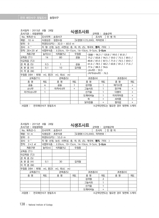 전국 해안사구 정밀조사 송정사구 138 ? National Institute of Ecology 조사일자 2015년 8월 28일 조사기관 국립생태원 식생조사표 군락명 곰솔군락 No. 북측선-4 조사지역 송정사구 조사자 민 병 미 해발10 m 식생상관 침엽수림 도엽명 1/25,000 , 격자번호 방위0 위경도 GPS 32.0 60.0 m 경사0 ° 지 형산정, 능선, 사면 상, 중, 하, 凹, 凸 , 계곡부, 평지, 기타 면적28×20 ㎡ 낙엽부식층 ≥20cm, 19-15cm, 14-10cm, 9-5cm, 5-0cm 계층구분 높이 m 식피율 % 우점종 곰솔 96.3 120.8 99.0 81.8 75.2 83.8 94.5 59.0 75.5 89.5 80.8 81.0 87.5 71.0 74.5 69.0 61.4 ...