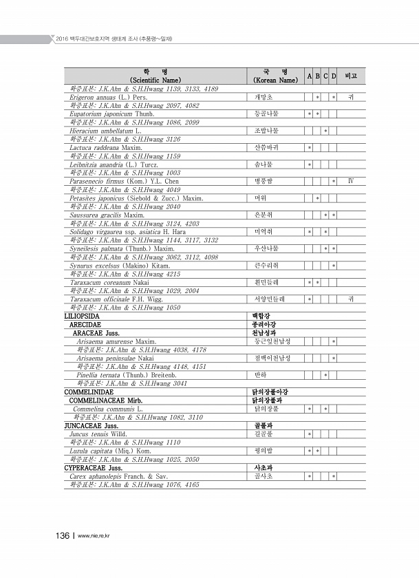 2016 백두대간보호지역 생태계 조사 추풍령밀재 136Ⅰwww.nie.re.kr 학 명 Scientific Name 국 명 Korean Name A B C D 비고 확증표본J.K.Ahn & S.H.Hwang 1139, 3133, 4189 Erigeron annuas L. Pers. 개망초 * * 귀 확증표본J.K.Ahn & S.H.Hwang 2097, 4082 Eupatorium japonicum Thunb. 등골나물 * * 확증표본J.K.Ahn & S.H.Hwang 1086, 2099 Hieracium umbellatum L. 조밥나물 * 확증표본J.K.Ahn & S.H.Hwang 3126 Lactuca raddeana Maxim. 산씀바귀 * 확증표본J.K.Ahn & S.H.Hwang 1159 Leibn...