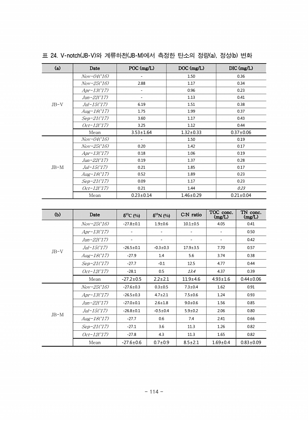 a Date POC mg/L DOC mg/L DIC mg/L JB-V Nov-04 16 1.50 0.36 Nov-25 16 2.88 1.17 0.34 Apr-13 17 0.96 0.23 Jun-22 17 1.13 0.41 Jul-15 17 6.19 1.51 0.38 Aug-18 17 1.75 1.99 0.37 Sep-21 17 3.60 1.17 0.43 Oct-12 17 3.25 1.12 0.44 Mean 3.53±1.64 1.32±0.33 0.37±0.06 JB-M Nov-04 16 1.50 0.19 Nov-25 16 0.20 1.42 0.17 Apr-13 17 0.18 1.06 0.19 Jun-22 17 0.19 1.37 0.28 Jul-15 17 0.21 1.85 0.17 Aug-18 17 0.52 1...