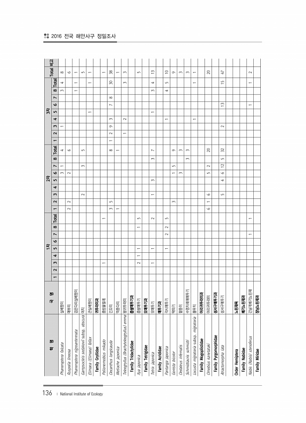 136 학 명 국 명 1차 2차 3차 Total 비고 1 2 3 4 5 6 7 8 Total 1 2 3 4 5 6 7 8 Total 1 2 3 4 5 6 7 8 Total Phaneroptera falcata 실베짱이 3 1 4 1 3 4 8 Ruspolia lineosa 매부리 2 2 2 6 6 Phaneroptera nigroantennata 검은다리실베짱이 1 1 1 Gampsocleis sedakovii subsp. obscura 여치 2 3 5 5 Elimaea Elimaea fallax 큰실베짱이 1 1 1 Family Gryllidae 귀뚜라미과 Polionemobius mikado 좀방울벌레 1 1 1 Oecanthus longicauda 긴꼬리 3 5 8 1 2 9 3 7 8 30 38 Me...