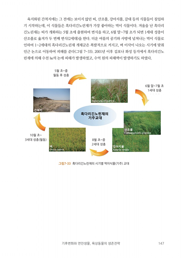 기후변화와 연안생물, 육상동물의 생존전략 147 그림7-33 흑다리긴노린재의 시기별 먹이식물 기주 교대 5월 초중 월동 후 성충 10월 초3세대 성충 월동 8월 초중 2세대 성충 6월 말7월 초 1세대 성충 육지화된 간척지에는 그 전에는 보이지 않던 띠, 산조풀, 강아지풀, 갈대 등의 식물들이 침입하 기 시작하는데, 이 식물들은 흑다리긴노린재가 가장 좋아하는 먹이 식물이다. 겨울을 난 흑다리 긴노린재는 띠가 개화하는 5월 초에 출현하여 번식을 하고, 6월 말7월 초가 되면 1세대 성충이 산조풀로 옮겨가 두 번째 번식 2세대 을 한다. 더운 여름의 공기와 사방에 넘쳐나는 먹이 식물로 인하여 12세대의 흑다리긴노린재 개체군은 폭발적으로 커지고, 벼 이삭이 나오는 시기에 맞춰 인근 논으로 이동하여 피해를 준다 그...