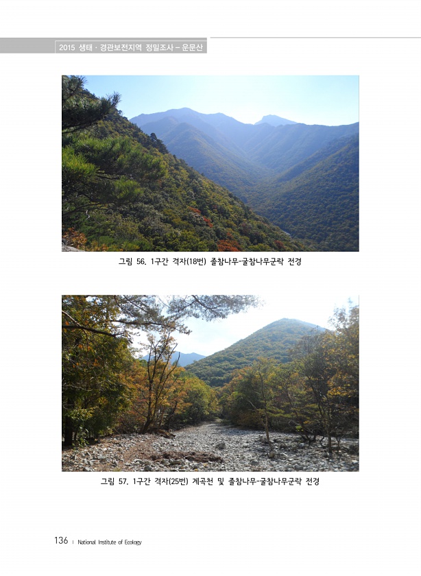 2015 생태·경관보전지역 정밀조사 운문산 136 ? National Institute of Ecology 그림 56. 1구간 격자 18번 졸참나무-굴참나무군락 전경 그림 57. 1구간 격자 25번 계곡천 및 졸참나무-굴참나무군락전경