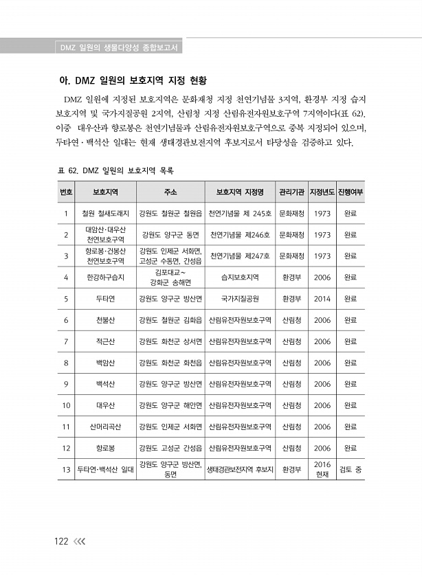 DMZ 일원의 생물다양성 종합보고서 122 아. DMZ 일원의 보호지역 지정 현황 DMZ 일원에 지정된 보호지역은 문화재청 지정 천연기념물 3지역, 환경부 지정 습지 보호지역 및 국가지질공원 2지역, 산림청 지정 산림유전자원보호구역 7지역이다 표 62 이중 대우산과 향로봉은 천연기념물과 산림유전자원보호구역으로 중복 지정되어 있으며, 두타연·백석산 일대는 현재 생태경관보전지역 후보지로서 타당성을 검증하고 있다. 번호 보호지역 주소 보호지역 지정명 관리기관 지정년도 진행여부 1 철원 철새도래지 강원도 철원군 철원읍 천연기념물 제 245호 문화재청 1973 완료 2 대암산·대우산 천연보호구역 강원도 양구군 동면 천연기념물 제246호 문화재청 1973 완료 3 향로봉·건봉산 천연보호구역 강원도 인제군 서화면, 고성...