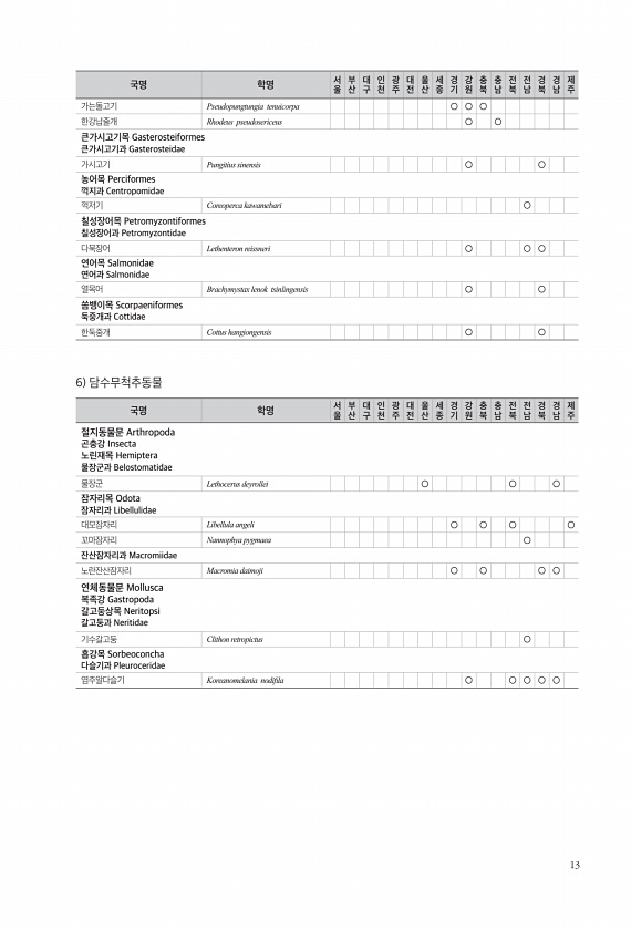 13 가는돌고기 Pseudopungtungia tenuicorpa ○ ○ ○ 한강납줄개 Rhodeus pseudosericeus ○ ○ 큰가시고기목 Gasterosteiformes 큰가시고기과 Gasterosteidae 가시고기 Pungitius sinensis ○ ○ 농어목 Perciformes 꺽지과 Centropomidae 꺽저기 Coreoperca kawamebari ○ 칠성장어목 Petromyzontiformes 칠성장어과 Petromyzontidae 다묵장어 Lethenteron reissneri ○ ○ ○ 연어목 Salmonidae 연어과 Salmonidae 열목어 Brachymystax lenok tsinlingensis ○ ○ 쏨뱅이목 Scorpaeniformes 둑중개과 Cottidae 한...