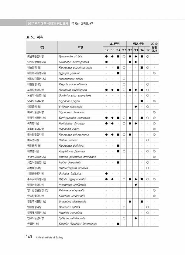 2017 백두대간 생태계 정밀조사 구룡산 고정조사구 140 ? National Institute of Ecology 표 53. 계속 국명 학명 소나무림 신갈나무림 2010 문헌 ‘12 ‘13 ‘14 ‘17 ‘12 ‘13 ‘14 ‘17 조사 꽃날개들명나방 Tyspanodes striata ● ◆ ■ ○ ● ◆ ■ ○ 날개노랑들명나방 Circobotys heterogenalis ● ● ◆ 네눈들명나방 Pleuroptya quadrimaculalis ■ ○ ■ ○ 네눈흰색들명나방 Lygropia yerburii ■ ◎ 네점노랑물명나방 Potamomusa midas ○ 네줄들명나방 Pagyda quinquelineata ...