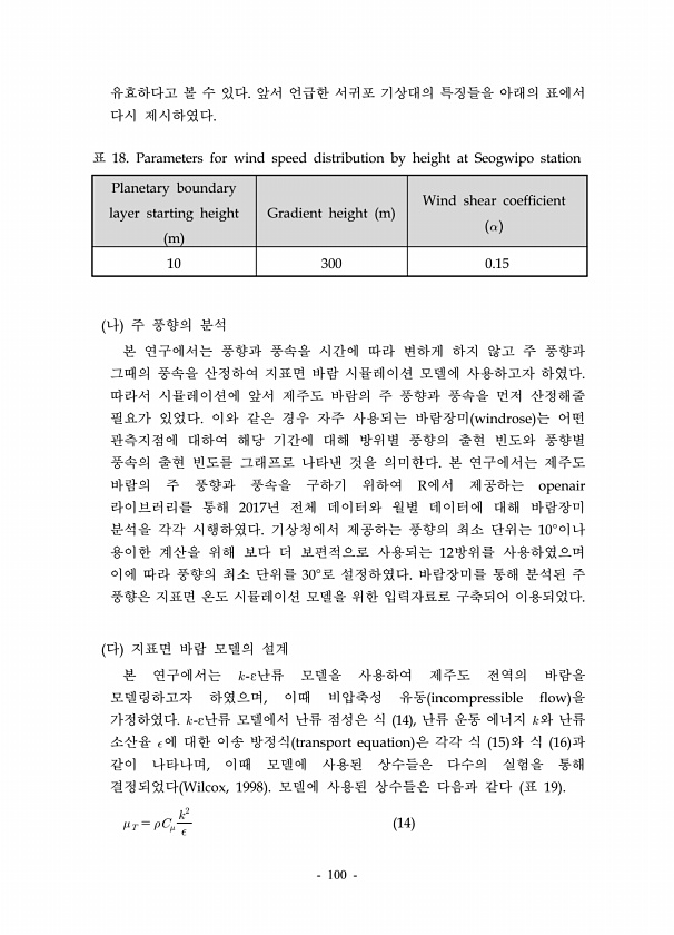100 유효하다고 볼 수 있다. 앞서 언급한 서귀포 기상대의 특징들을 아래의 표에서 다시 제시하였다. Planetary boundary layer starting height m Gradient height m Wind shear coefficient 10 300 0.15 표 18. Parameters for wind speed distribution by height at Seogwipo station 나 주 풍향의 분석 본 연구에서는 풍향과 풍속을 시간에 따라 변하게 하지 않고 주 풍향과 그때의 풍속을 산정하여 지표면 바람 시뮬레이션 모델에 사용하고자 하였다. 따라서 시뮬레이션에 앞서 제주도 바람의 주 풍향과 풍속을 먼저 산정해줄 필요가 있었다. 이와 같은 경우 자주 사용되는 바람장미 windrose...
