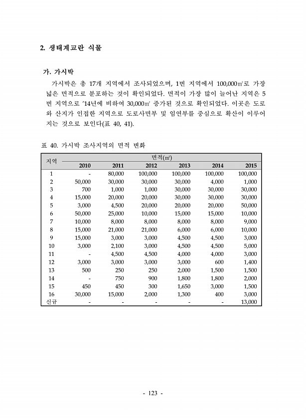 123 2. 생태계교란 식물 가. 가시박 가시박은 총 17개 지역에서 조사되었으며, 1번 지역에서 100,000㎡로 가장 넓은 면적으로 분포하는 것이 확인되었다. 면적이 가장 많이 늘어난 지역은 5 번 지역으로 ’14년에 비하여 30,000㎡ 증가된 것으로 확인되었다. 이곳은 도로 와 산지가 인접한 지역으로 도로사면부 및 임연부를 중심으로 확산이 이루어 지는 것으로 보인다 표 40, 41 지역 면적 ㎡ 2010 2011 2012 2013 2014 2015 1 80,000 100,000 100,000 100,000 100,000 2 50,000 30,000 30,000 30,000 4,000 1,000 3 700 1,000 1,000 30,000 30,000 30,000 4 15,000 20,000 20,00...