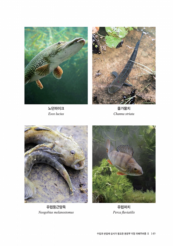 수입과 반입에 심사가 필요한 환경부 지정 위해우려종 Ⅱ 149 노던파이크 Esox lucius 유럽둥근망둑 Neogobius melanostomus 줄가물치 Channa striata 유럽퍼치 Percafuviatilis