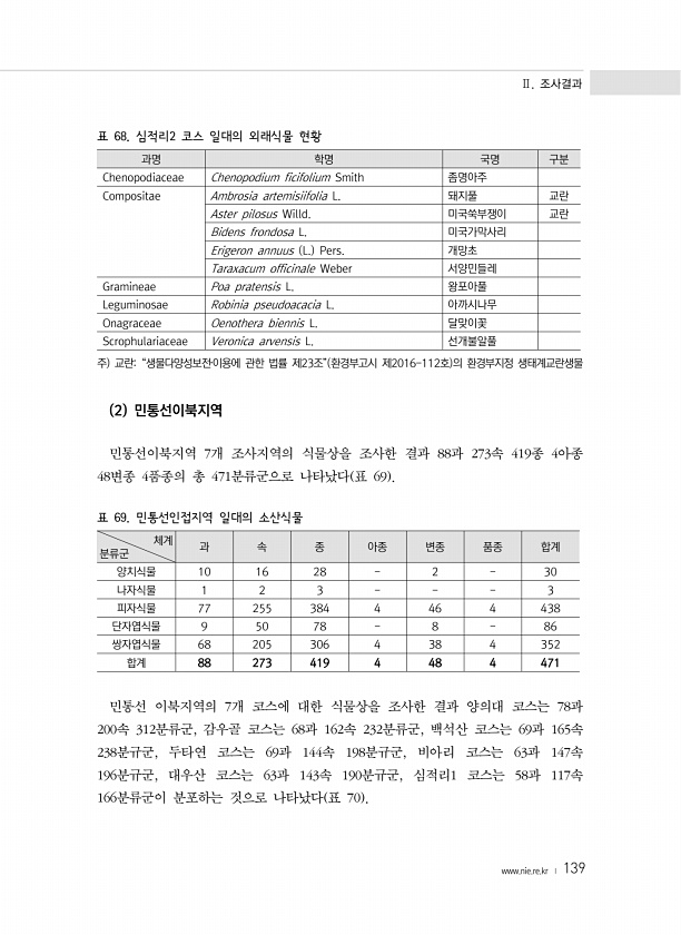 Ⅱ. 조사결과 www.nie.re.kr ? 139 표 68. 심적리2 코스 일대의 외래식물 현황 과명 학명 국명 구분 Chenopodiaceae Chenopodium ficifolium Smith 좀명아주 Compositae Ambrosia artemisiifolia L. 돼지풀 교란 Aster pilosus Willd. 미국쑥부쟁이 교란 Bidens frondosa L. 미국가막사리 Erigeron annuus L. Pers. 개망초 Taraxacum officinale Weber 서양민들레 Gramineae Poa pratensis L. 왕포아풀 Leguminosae Robinia pseudoacacia L. 아까시나무 Onagraceae Oenothera biennis L. 달맞이꽃 Scrophular...
