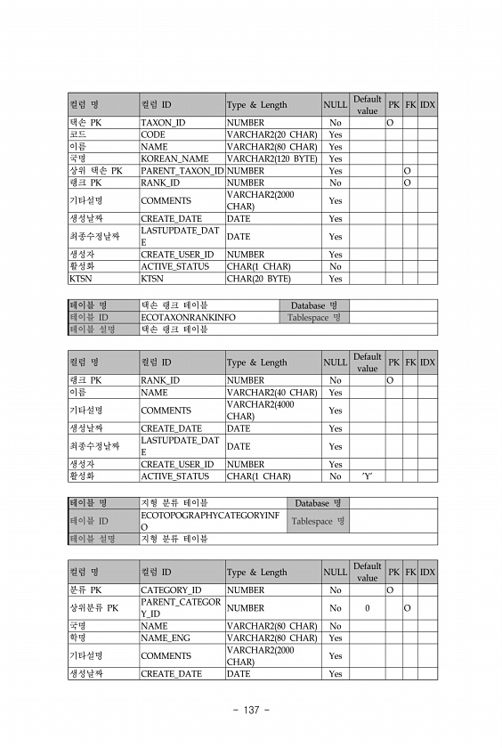 137 컬럼 명 컬럼 ID Type & Length NULL Default value PK FK IDX 택손 PK TAXON_ID NUMBER No O 코드 CODE VARCHAR2 20 CHAR Yes 이름 NAME VARCHAR2 80 CHAR Yes 국명 KOREAN_NAME VARCHAR2 120 BYTE Yes 상위 택손 PK PARENT_TAXON_ID NUMBER Yes O 랭크 PK RANK_ID NUMBER No O 기타설명 COMMENTS VARCHAR2 2000 CHAR Yes 생성날짜 CREATE_DATE DATE Yes 최종수정날짜 LASTUPDATE_DAT E DATE Yes 생성자 CREATE_USER_ID NUMBER Yes 활성화 ACTIVE_STATUS CHAR 1 CHAR ...