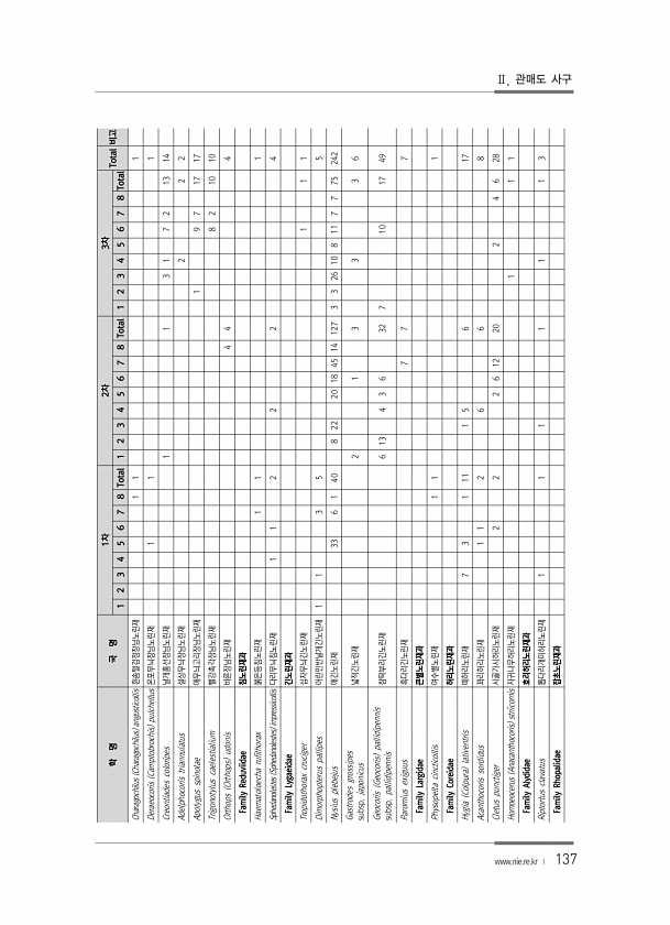 137 학 명 국 명 1차 2차 3차 Total 비고 1 2 3 4 5 6 7 8 Total 1 2 3 4 5 6 7 8 Total 1 2 3 4 5 6 7 8 Total Charagochilus Charagochilus angusticollis 흰솜털검정장님노린재 1 1 1 Deraeocoris Camptobrochis pulchellus 온포무늬장님노린재 1 1 1 Creontiades coloripes 날개홍선장님노린재 1 1 3 1 7 2 13 14 Adelphocoris triannulatus 설상무늬장님노린재 2 2 2 Apolygus spinolae 애무늬고리장님노린재 1 9 7 17 17 Trigonotylus caelestialium 빨강촉각장님노린재 8 2 10 10 Orthops Orth...