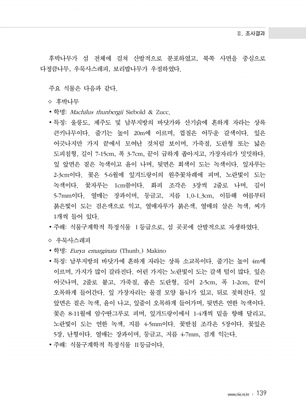 Ⅱ. 조사결과 www.nie.re.kr ? 139 후박나무가 섬 전체에 걸쳐 산발적으로 분포하였고, 북쪽 사면을 중심으로 다정큼나무, 우묵사스레피, 보리밥나무가 우점하였다. 주요 식물은 다음과 같다. ◇ 후박나무 ? 학명Machilus thunbergii Siebold & Zucc. ? 특징울릉도, 제주도 및 남부지방의 바닷가와 산기슭에 흔하게 자라는 상록 큰키나무이다. 줄기는 높이 20m에 이르며, 껍질은 어두운 갈색이다. 잎은 어긋나지만 가지 끝에서 모여난 것처럼 보이며, 가죽질, 도란형 또는 넓은 도피침형, 길이 7-15cm, 폭 3-7cm, 끝이 급하게 좁아지고, 가장자리가 밋밋하다. 잎 앞면은 짙은 녹색이고 윤이 나며, 뒷면은 회색이 도는 녹색이다. 잎자루는 2-3cm이다. 꽃은 5-6월에 잎겨드랑...