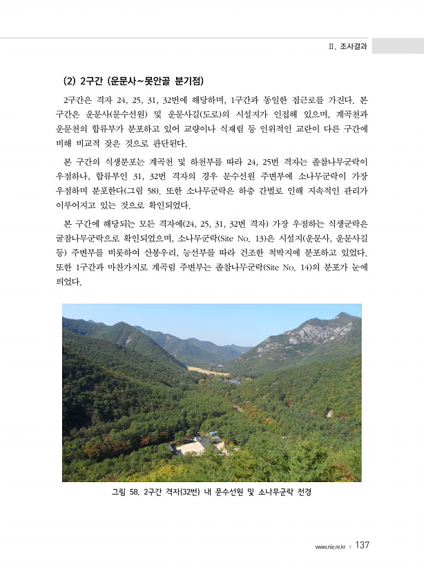 Ⅱ. 조사결과 www.nie.re.kr ? 137 2 2구간 운문사∼못안골 분기점 2구간은 격자 24, 25, 31, 32번에 해당하며, 1구간과 동일한 접근로를 가진다. 본 구간은 운문사 문수선원 및 운문사길 도로 의 시설지가 인접해 있으며, 계곡천과 운문천의 합류부가 분포하고 있어 교량이나 식재림 등 인위적인 교란이 다른 구간에 비해 비교적 잦은 것으로 판단된다. 본 구간의 식생분포는 계곡천 및 하천부를 따라 24, 25번 격자는 졸참나무군락이 우점하나, 합류부인 31, 32번 격자의 경우 문수선원 주변부에 소나무군락이 가장 우점하며 분포한다 그림 58 또한 소나무군락은 하층 간벌로 인해 지속적인 관리가 이루어지고 있는 것으로 확인되었다. 본 구간에 해당되는 모든 격자에 24, 25, 31, 32번 격자...