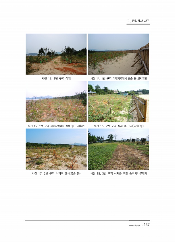 Ⅱ. 금일명사 사구 www.nie.re.kr ? 137 사진 13. 1번 구역 식재 사진 14. 1번 구역 식재지역에서 곰솔 등 고사확인 사진 15. 1번 구역 식재지역에서 곰솔 등 고사확인 사진 16. 2번 구역 식재 후 고사 곰솔 등 사진 17. 2번 구역 식재후 고사 곰솔 등 사진 18. 3번 구역 식재를 위한순비기나무제거