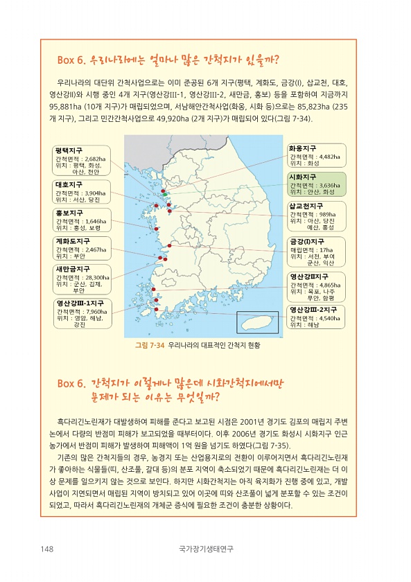 148 국가장기생태연구 Box 6. 우리나라에는 얼마나 많은 간척지가 있을까? 우리나라의 대단위 간척사업으로는 이미 준공된 6개 지구 평택, 계화도, 금강 I , 삽교천, 대호, 영산강II 와 시행 중인 4개 지구 영산강III-1, 영산강III-2, 새만금, 홍보 등을 포함하여 지금까지 95,881ha 10개 지구 가 매립되었으며, 서남해안간척사업 화옹, 시화 등 으로는 85,823ha 235 개 지구 , 그리고 민간간척사업으로 49,920ha 2개 지구 가 매립되어 있다 그림 7-34 Box 6. 간척지가 이렇게나 많은데 시화간척지에서만 문제가 되는 이유는 무엇일까? 흑다리긴노린재가 대발생하여 피해를 준다고 보고된 시점은 2001년 경기도 김포의 매립지 주변 논에서 다량의 반점미 피해가 보고되었을 때부터이...