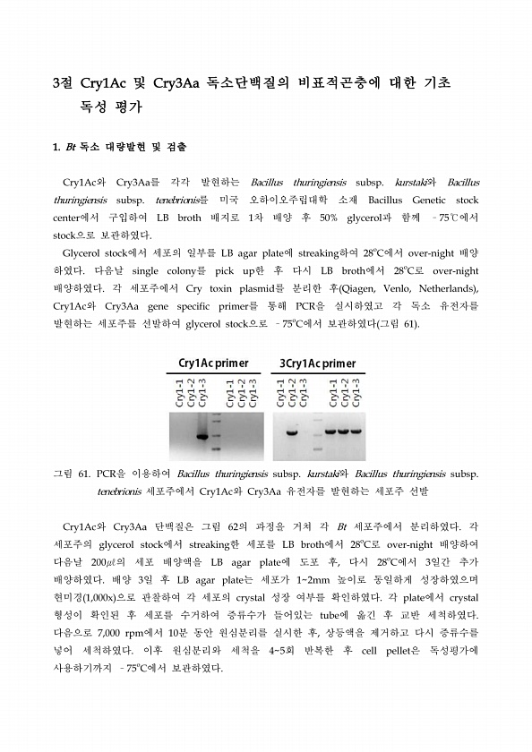 3절 Cry1Ac 및 Cry3Aa 독소단백질의 비표적곤충에 대한 기초 독성 평가 1. Bt 독소 대량발현 및 검출 Cry1Ac와 Cry3Aa를 각각 발현하는 Bacillus thuringiensis subsp. kurstaki와 Bacillus thuringiensis subsp. tenebrionis를 미국 오하이오주립대학 소재 Bacillus Genetic stock center에서 구입하여 LB broth 배지로 1차 배양 후 50% glycerol과 함께 ?75℃에서 stock으로 보관하였다. Glycerol stock에서 세포의 일부를 LB agar plate에 streaking하여 28oC에서 over-night 배양 하였다. 다음날 single colony를 pick up한 후 다시 LB bro...