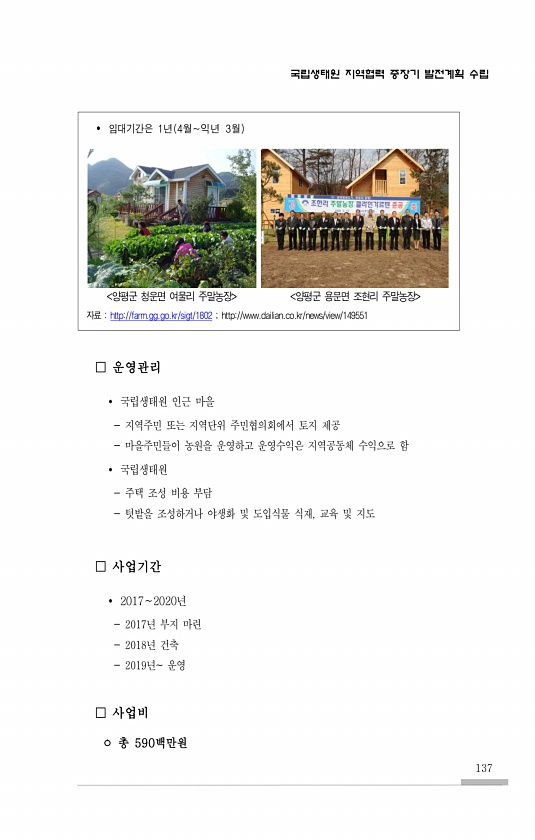 국립생태원 지역협력 중장기 발전계획 수립 137 ? 임대기간은 1년 4월익년 3월 양평군 청운면 여물리 주말농장 양평군 용문면 조현리 주말농장 자료 http//farm.gg.go.kr/sigt/1802 ; http//www.dailian.co.kr/news/view/149551 □ 운영관리 ? 국립생태원 인근 마을 지역주민 또는 지역단위 주민협의회에서 토지 제공 마을주민들이 농원을 운영하고 운영수익은 지역공동체 수익으로 함 ? 국립생태원 주택 조성 비용 부담 텃밭을 조성하거나 야생화 및 도입식물 식재, 교육 및 지도 □ 사업기간 ? 2017∼2020년 2017년 부지 마련 2018년 건축 2019년운영 □ 사업비 ? 총590백만원