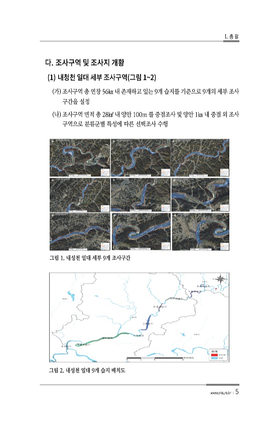 I. 총 괄 www.nie.re.kr ? 5 1 12 가 조사구역 총 연장 56㎞ 내 존재하고 있는 9개 습지를 기준으로 9개의 세부 조사 구간을 설정 나 조사구역 면적 총 28㎢ 내 양안 100m 를 중점조사 및 양안 1㎞ 내 중점 외 조사 구역으로 분류군별 특성에 따른 선택조사 수행 그림 1. 내성천 일대 세부 9개 조사구간 그림 2. 내성천 일대 9개 습지배치도