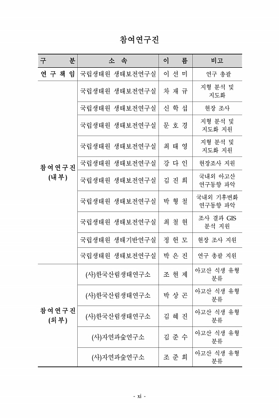 xi 참여연구진 구 분 소 속 이 름 비고 연 구 책 임 국립생태원 생태보전연구실 이 선 미 연구 총괄 참여 연구진 내 부 국립생태원 생태보전연구실 차 재 규 지형 분석 및 지도화 국립생태원 생태보전연구실 신 학 섭 현장 조사 국립생태원 생태보전연구실 문 호 경 지형 분석 및 지도화 지원 국립생태원 생태보전연구실 최 태 영 지형 분석 및 지도화 지원 국립생태원 생태보전연구실 강 다 인 현장조사 지원 국립생태원 생태보전연구실 김 진 희 국내외 아고산 연구동향 파악 국립생태원 생태보전연구실 박 형 철 국내외 기후변화 연구동향 파악 국립생태원 생태보전연구실 최 철 현 조사 결과 GIS 분석 지원 국립생태원 생태기반연구실 정 헌 모 현장 조사 지원 국립생태원 생태보전연구실 박 은 진 연구 총괄 지원 참여 연구진 외...