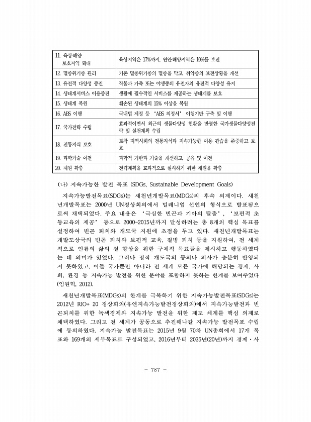 787 11. 육상?해양 보호지역 확대 육상지역은 17%까지, 연안?해양지역은 10%를 보전 12. 멸종위기종 관리 기존 멸종위기종의 멸종을 막고, 취약종의 보전상황을 개선 13. 유전적 다양성 증진 작물과 가축 또는 야생종의 유전자의 유전적 다양성 유지 14. 생태계서비스 이용증진 생활에 필수적인 서비스를 제공하는 생태계를 보호 15. 생태계 복원 훼손된 생태계의 15% 이상을 복원 16. ABS 이행 국내법 제정 등 ‘ABS 의정서’ 이행기반 구축 및 이행 17. 국가전략 수립 효과적이면서 최근의 생물다양성 현황을 반영한 국가생물다양성전 략 및 실천계획 수립 18. 전통지식 보호 토착 지역사회의 전통지식과 지속가능한 이용 관습을 존중하고 보 호 19. 과학기술 이전 과학적 기반과 기술을 개선하고, 공유 ...