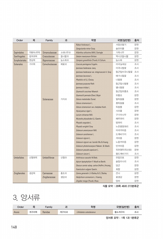 148 Rubus fruticosus L. 서양산딸기 문헌 Sanguisorba minor Scop. 술오이풀 문헌 Sapindales 무환자나무목 Simaroubaceae 소태나무과 Ailanthus altissima Mill. Swingle 가죽나무 문헌 Saxifragales 범의귀목 Crassulaceae 돌나물과 Sedum mexicanum Britton 멕시코돌나물 문헌 Scrophulariales 현삼목 Bignoniaceae 능소화과 Campsis grandifolia Thunb. K.Schum. 능소화 문헌 Solanales 가지목 Convolvulaceae 메꽃과 Cuscuta pentagona Engelm. 미국실새삼 조사 Ipomoea hederacea Jacq. 미국나팔꽃 조사 Ipo...
