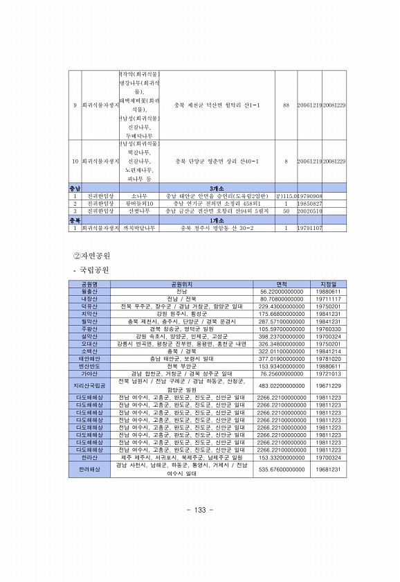 133 9 희귀식물자생지 백작약 희귀식물 , 댕강나무 희귀식 물 , 태백제비꽃 희귀 식물 , 천남성 희귀식물 , 신갈나무, 두메닥나무 충북 제천군 덕산면 월악리 산1-1 88 2006121920081229 10 희귀식물자생지 천남성 희귀식물 , 떡갈나무, 신갈나무, 노린재나무, 피나무 등 충북 단양군 영춘면 상리 산40-1 8 2006121920081229 충남 3개소 1 진귀한임상 소나무 충남 태안군 안면읍 승언리 도유림2임반 공 115.0019790908 2 진귀한임상 왕버들외10 충남 연기군 전의면 소정리 458외1 1 19850827 3 진귀한임상 산벚나무 충남 금산군 진산면 오항리 산94외 5필지 50 20020510 충북 1개소 1 희귀식물자생지 까치박달나무 충북 청주시 명암동 산 30-2 1 1...