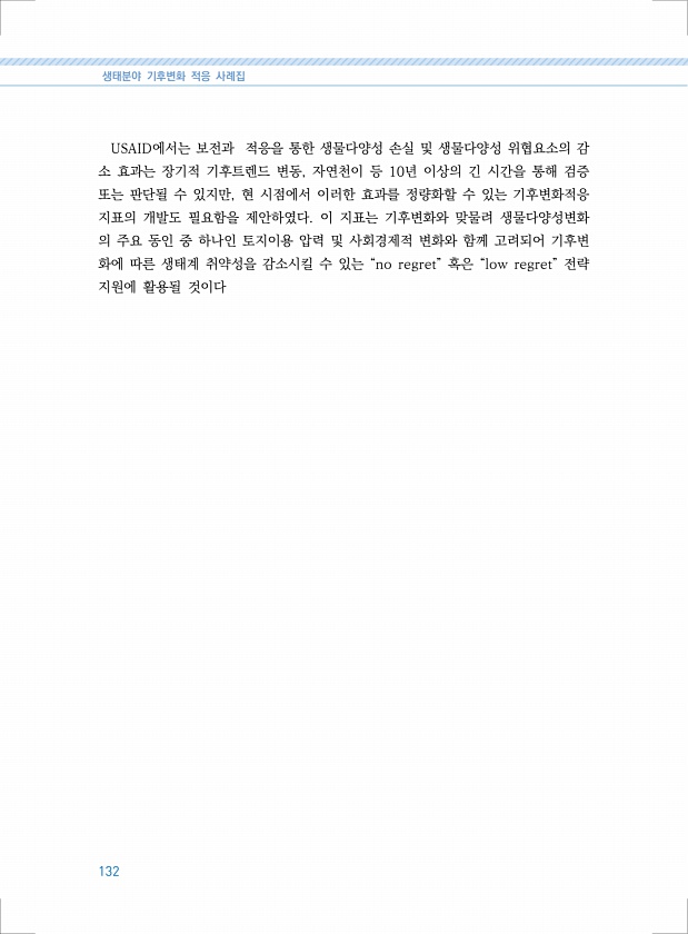 생태분야 기후변화 적응 사례집 132 USAID에서는 보전과 적응을 통한 생물다양성 손실 및 생물다양성 위협요소의 감 소 효과는 장기적 기후트렌드 변동, 자연천이 등 10년 이상의 긴 시간을 통해 검증 또는 판단될 수 있지만, 현 시점에서 이러한 효과를 정량화할 수 있는 기후변화적응 지표의 개발도 필요함을 제안하였다. 이 지표는 기후변화와 맞물려 생물다양성변화 의 주요 동인 중 하나인 토지이용 압력 및 사회경제적 변화와 함께 고려되어 기후변 화에 따른 생태계 취약성을 감소시킬 수 있는 “no regret” 혹은 “low regret” 전략 지원에 활용될것이다