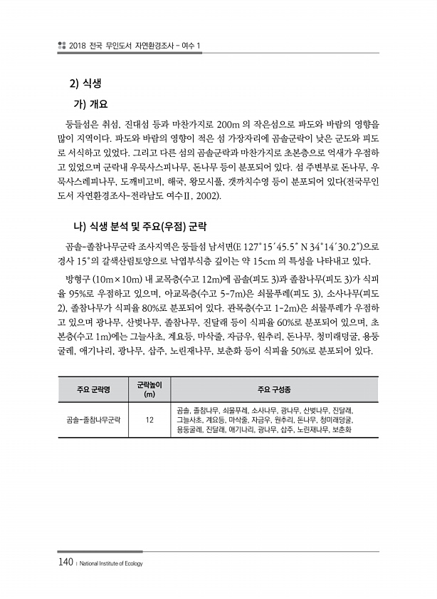 2018 전국 무인도서 자연환경조사 여수 1 140 ? National Institute of Ecology 2 둥들섬은 취섬, 진대섬 등과 마찬가지로 200m 의 작은섬으로 파도와 바람의 영향을 많이 지역이다. 파도와 바람의 영향이 적은 섬 가장자리에 곰솔군락이 낮은 군도와 피도 로 서식하고 있었다. 그리고 다른 섬의 곰솔군락과 마찬가지로 초본층으로 억새가 우점하 고 있었으며 군락내 우묵사스피나무, 돈나무 등이 분포되어 있다. 섬 주변부로 돈나무, 우 묵사스레피나무, 도깨비고비, 해국, 왕모시풀, 갯까치수영 등이 분포되어 있다 전국무인 도서 자연환경조사-전라남도 여수Ⅱ, 2002 곰솔-졸참나무군락 조사지역은 둥들섬 남서면 E 127°15′45.5″ N 34°14′30.2″ 으로 경사 15°의 갈색산림토양으...