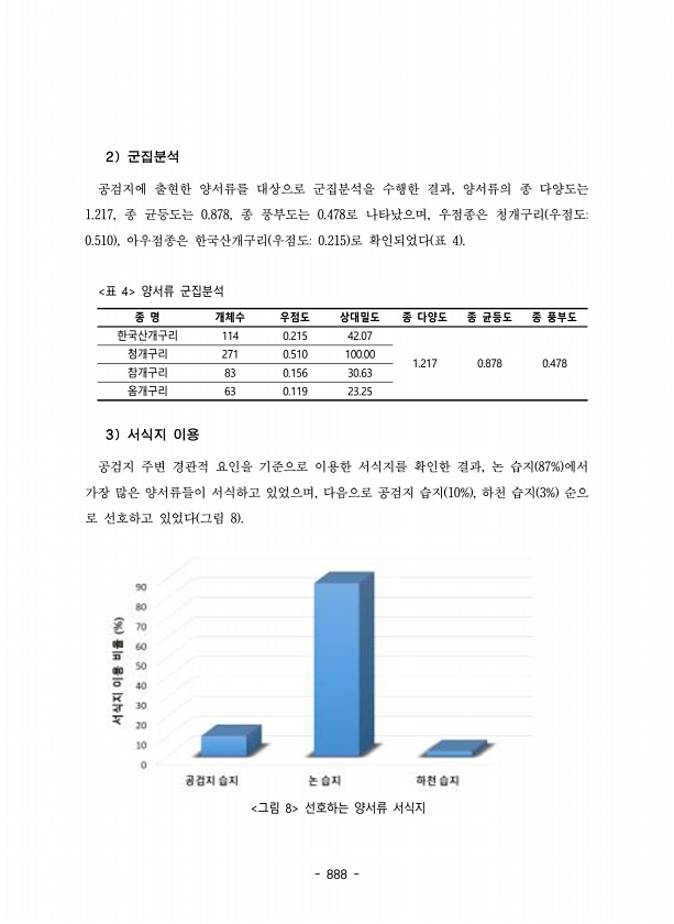 888 2 군집분석 공검지에 출현한 양서류를 대상으로 군집분석을 수행한 결과, 양서류의 종 다양도는 1.217, 종 균등도는 0.878, 종 풍부도는 0.478로 나타났으며, 우점종은 청개구리 우점도0.510 , 아우점종은 한국산개구리 우점도0.215 로 확인되었다 표 4 종 명 개체수 우점도 상대밀도 종 다양도 종 균등도 종 풍부도 한국산개구리 114 0.215 42.07 1.217 0.878 0.478 청개구리 271 0.510 100.00 참개구리 83 0.156 30.63 옴개구리 63 0.119 23.25 표 4 양서류 군집분석 3 서식지 이용 공검지 주변 경관적 요인을 기준으로 이용한 서식지를 확인한 결과, 논 습지 87% 에서 가장 많은 양서류들이 서식하고 있었으며, 다음으로 공검지 습지 10%...