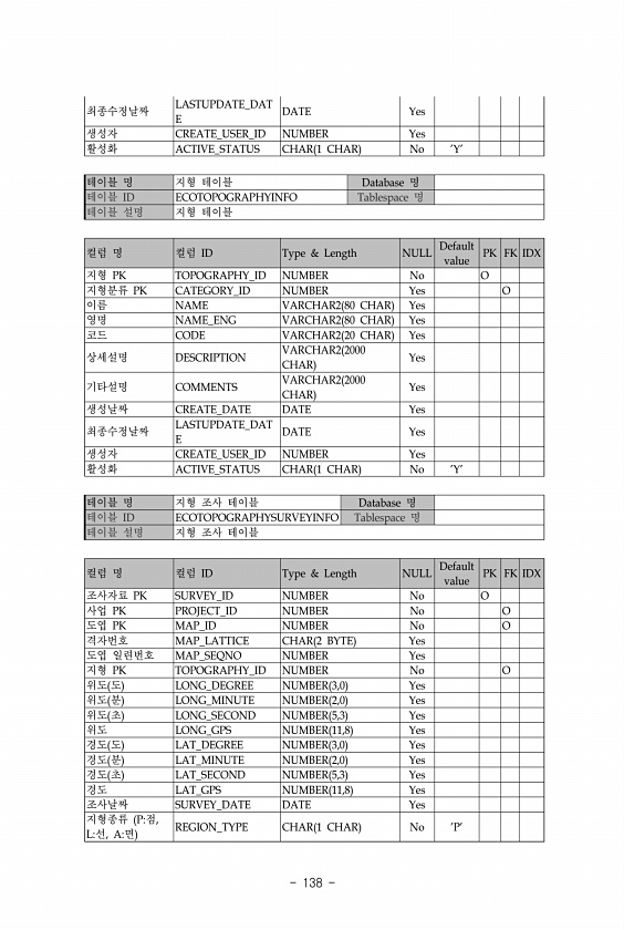 138 최종수정날짜 LASTUPDATE_DAT E DATE Yes 생성자 CREATE_USER_ID NUMBER Yes 활성화 ACTIVE_STATUS CHAR 1 CHAR No Y테이블 명 지형 테이블 Database 명 테이블 ID ECOTOPOGRAPHYINFO Tablespace 명 테이블 설명 지형 테이블 컬럼 명 컬럼 ID Type & Length NULL Default value PK FK IDX 지형 PK TOPOGRAPHY_ID NUMBER No O 지형분류 PK CATEGORY_ID NUMBER Yes O 이름 NAME VARCHAR2 80 CHAR Yes 영명 NAME_ENG VARCHAR2 80 CHAR Yes 코드 CODE VARCHAR2 20 CHAR Yes 상세설명 DESCRIPT...