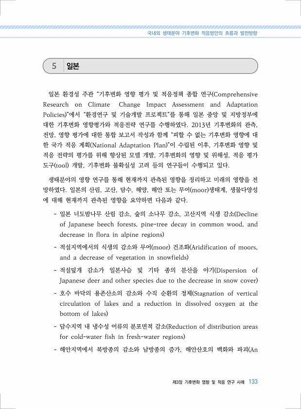 국내외 생태분야 기후변화 적응방안의 흐름과 발전방향 제3장 기후변화 영향 및 적응 연구 사례 133 5 일본 일본 환경성 주관 “기후변화 영향 평가 및 적응정책 종합 연구 Comprehensive Research on Climate Change Impact Assessment and Adaptation Policies ”에서 “환경연구 및 기술개발 프로젝트”를 통해 일본 중앙 및 지방정부에 대한 기후변화 영향평가와 적응전략 연구를 수행하였다. 2013년 기후변화의 관측, 전망, 영향 평가에 대한 통합 보고서 작성과 함께 “피할 수 없는 기후변화 영향에 대 한 국가 적응 계획 National Adaptation Plan ”이 수립된 이후, 기후변화 영향 및 적응 전략의 평가를 위해 향상된 모델 개발, 기후변화...