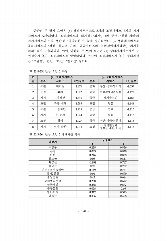 128 안산의 두 번째 요인은 + 생태계서비스로 5개의 조절서비스, 3개의 지지 서비스가 도출되었다. 조절서비스의 ‘대기질’, ‘화재’, ‘1차 생산’, ‘폭풍 재해’와 지지서비스의 ‘1차 생산’과 ‘영양순환’이 높게 평가되었다. 생태계서비스로 문화서비스의 ‘정신?종교적 가치’, 공급서비스의 친환경에너지발전, 폐기물 처리등이 도출되었다. 이에, 안산의 두 번째 요인은 + 생태계서비스에서 요 인점수가 높은 조절서비스로 명명하였다. 안산에 조절서비스가 높은 생태자산 은 ‘수암봉’, ‘큰산’, ‘마산’, ‘칠보산’ 등이다. 순 위 + 생태계서비스 생태계서비스 분류 서비스 요인점수 분류 서비스 요인점수 1 조절 대기질 1.876 문화 정신?종교적 가치 -1.337 2 조절 화재 1.822 공급 친환경에너지발전 -1...