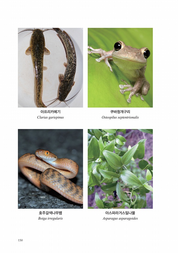 150 아프리카메기 Clarias gariepinus 호주갈색나무뱀 Boiga irregularis 쿠바청개구리 Osteopilus septentrionalis 아스파라거스밀나물 Asparagusasparagoides